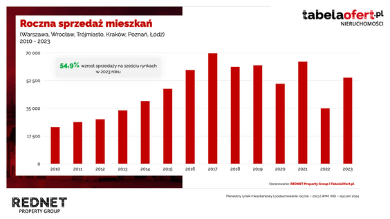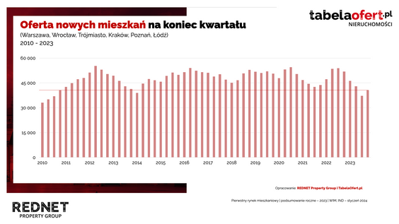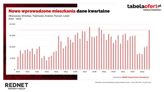 - Choć taki scenariusz był brany pod uwagę, to dane z IV kwartału 2023 roku są mimo wszystko zaskakujące. Tylko trzy razy w ciągu ostatnich trzynastu lat (52 kwartałów) kwartalna podaż nowych mieszkań w sześciu największych miastach była większa niż w ciągu ostatnich trzech miesięcy ubiegłego roku – mówią autorzy raportu REDNET Property Group i portalu Tabelaofert.pl. - Taka sytuacja przełożyła się na znaczące ograniczenie dynamiki wzrostu cen.