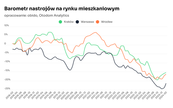 - Nastroje konsumenckie to jeden z istotnych czynników wpływających na sytuację na rynku nieruchomości. Notowania barometru nastrojów na rynku mieszkaniowym, przygotowywanego dla „Nieruchomości” „Rzeczpospolitej” przez Otodom Analytics wskazują, że są one coraz lepsze – mówi Marcin Krasoń, ekspert Otodom Analytics. - Biorący pod uwagę ceny i możliwości zakupowe klientów wskaźnik na wszystkich badanych rynkach rośnie od przełomu roku.