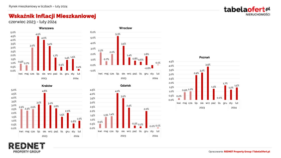 Opracowany przez REDNET Property Group i portal Tabelaofert.pl tzw. wskaźnik inflacji mieszkaniowej (WIM) pokazuje realne zmiany cen mieszkań deweloperskich. Eksperci analizują 10 proc. oferty mieszkań z pięciu miast – Warszawy, Krakowa, Wrocławia, Gdańska i Poznania, wyłączając apartamenty, które zawyżają średnią cenę. Porównywane są typowe, łatwo zastępowalne w analizach lokale z segmentu popularnego i średniego.