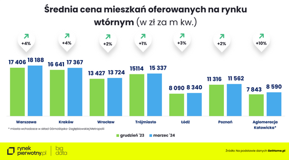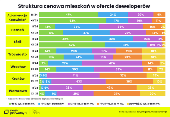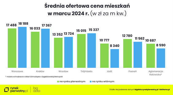 Czy podobnie jest w Krakowie (ponad 16 tys. zł/mkw.), Wrocławiu (ponad 13,3 tys. zł) i Trójmieście (ponad 15 tys. zł)? Jak mówi Marek Wielgo, w tych metropoliach średnia cena mkw. nowych mieszkań w marcu utrzymała poziom z lutego. - W poprzednich miesiącach zdarzały się tam jednak wahnięcia cen. Ostatecznie Trójmiasto jest jedyną metropolią, w której średnia cena mkw. nowych mieszkań zachowała wartość z końcówki ubiegłego roku – zwraca uwagę Marek Wielgo.
