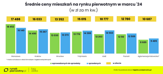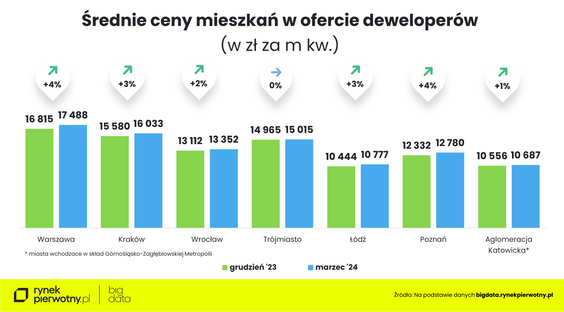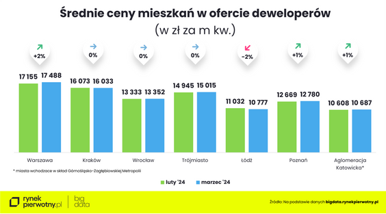 - Na czele w wyścigu cenowym znalazły się Warszawa i Poznań. W stolicy nowe mieszkania podrożały w marcu średnio aż o 2 proc. (do niespełna 17,5 tys. zł), a w Poznaniu – o 1 proc. – do niemal 12,8 tys. zł – podaje ekspert portalu RynekPierwotny.pl. – W Poznaniu ceny nowych mieszkań pną się w tym roku w górę systematycznie, natomiast w Warszawie sytuacja przypomina rollercoaster. W styczniu średnia cena mkw. nowych lokali w stolicy wzrosła o 2 proc., w lutym się nie zmieniła, zaś w marcu znów wzrosła.