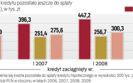 - Poziom zadłużenia złotówkowiczów wynosi odpowiednio: 245,4 tys. zł (kredyt z 2006 r.), 251,4 tys. zł (kredyt z 2007 r.), 256,7 tys. zł (kredyt z 2008 r.) oraz 267,7 tys. zł (kredyt z 2009 r.).