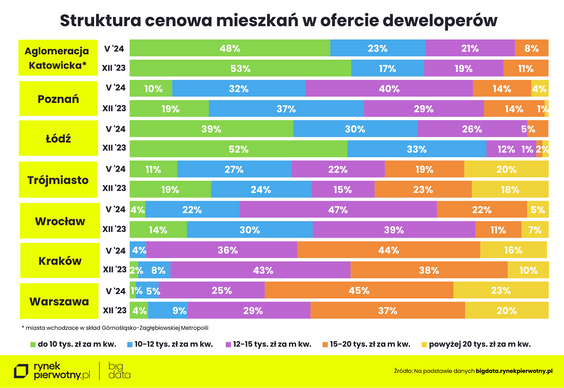 O stabilizacji można też mówić w przypadku miast Górnośląsko-Zagłębiowskiej Metropoli. - Tam już od trzech miesięcy średnia cena nowych mieszkań utrzymuje się na poziomie 10,6 tys. zł za metr, a od grudnia ubiegłego roku wzrosła tylko o 1 proc., czyli najmniej wśród wszystkich metropolii – podkreśla Wielgo. - Cieszyć może wyhamowanie wzrostu średniej ceny metra kwadratowego nowych mieszkań w Poznaniu.
