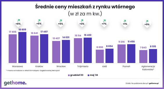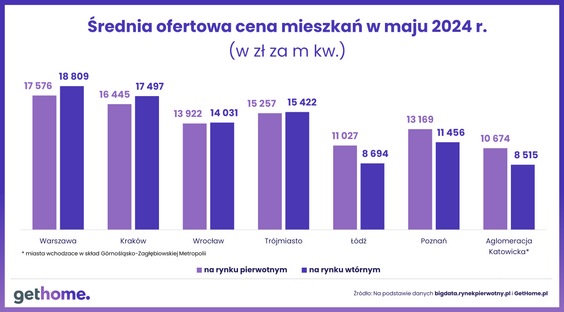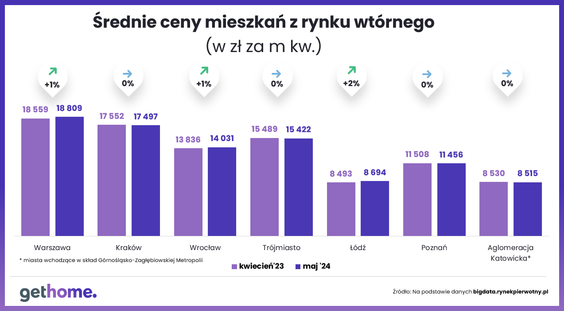 Z analiz portalu Gethome.pl wynika, że maj przyniósł stabilizację średnich cen mieszkań używanych w Krakowie, Poznaniu, Trójmieście i Aglomeracji Katowickiej. Lokale zdrożały w Łodzi, Warszawie i Wrocławiu.