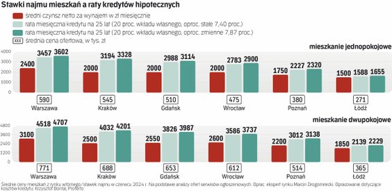 Także stawki najmu mieszkań dwupokojowych w dużych miastach są niższe niż rata kredytu za takie lokale. Jak podaje Marcin Drogomirecki, średnia cena ofertowa dwupokojowych lokali w Warszawie to 771 tys. zł, a średni czynsz – 3,1 tys. zł. Krzysztof Bontal szacuje, że miesięczna rata kredytu zaciągniętego na taki lokal to ponad 4,5 tys. (oprocentowanie stałe) i 4,7 tys. zł (zmienne). W Krakowie dwupokojowe mieszkania kosztują średnio 688 tys. zł. Za wynajem dwóch pokoi właściciele żądają przeciętnie 2,5 tys. zł miesięcznie, podczas gdy rata za lokal kupiony za taką cenę to ponad 4 i 4,2 tys. zł (w zależności od oprocentowania).