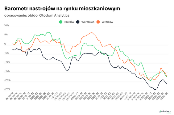 - Uspokojenie sytuacji jesienią ubiegłego roku sprawiło czasową poprawę nastrojów. Wskaźnik powoli rósł, ale ostatnio znów zaczął spadać i to we wszystkich badanych miastach – w Krakowie, Warszawie i Wrocławiu – mówi Marcin Krasoń. - Wskaźnik, przy wyliczaniu którego pod uwagę brane są nie tylko ceny mieszkań, ale i ich struktura (ceny/pokoje) oraz możliwości zakupowe klientów, obrazuje ich nastawienie do tego, co dzieje się na rynku – wyjaśnia.
