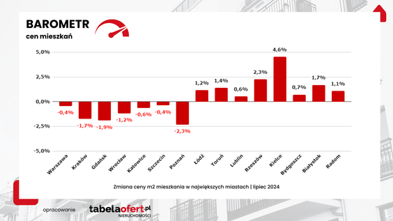 Spośród 15 monitorowanych przez portal Tabelaofert.pl miast ceny nowych lokali spadły w siedmiu. Jak tłumaczą autorzy barometru, spadki średnich cen to efekt przede wszystkim wprowadzania do oferty tańszych mieszkań. Wzrosty są spowodowane dosypywaniem do oferty mieszkań droższych.