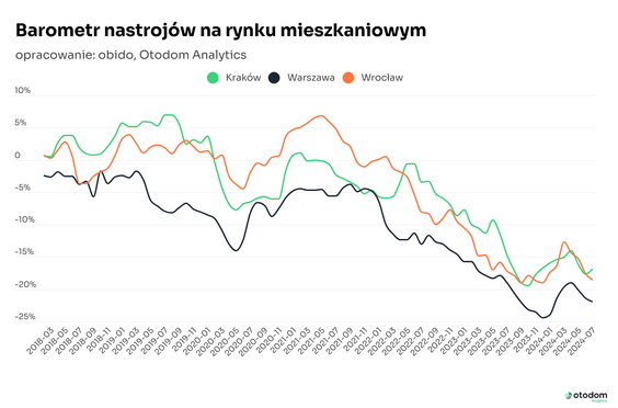 Ekspert Otodom Analytics zaznacza jednocześnie, że nastroje kupujących, choć lepsze od najniższych, nadal są niezbyt optymistyczne. - Barometr nastrojów na rynku mieszkaniowym przygotowywany przez Otodom Analytics dla „Nieruchomości” „Rzeczpospolitej” od roku błąka się w okolicy historycznych minimów – mówi Marcin Krasoń. - Nastroje się nie pogarszają, ale poprawa idzie bardzo powoli - i dotyczy to wszystkich trzech badanych miast: Krakowa, Warszawy i Wrocławia.