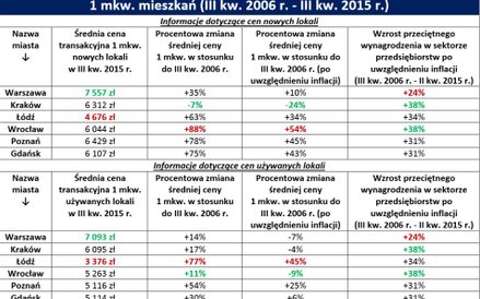 Największą taką zmianę możemy zaobserwować w Łodzi. W relacji do trzeciego kwartału 2006 r. wynosi ona aż 77 proc. (45 proc. po uwzględnieniu inflacji). Powyższe zestawienie oprócz informacji cenowych prezentuje również wzrosty średniego wynagrodzenia w sektorze przedsiębiorstw (trzeci kwartał 2006 r. - drugi kwartał 2015 r.). Zmiany dotyczące sześciu metropolii, po uwzględnieniu inflacji wynoszą od 24 proc. (Warszawa) do 38 proc. (Kraków, Wrocław).