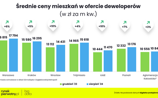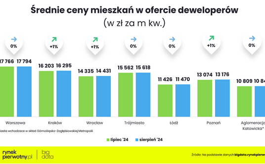 W Warszawie i Górnośląsko-Zagłębiowskiej Metropolii sierpień był piątym w tym roku miesiącem, w którym średnia cena metra kwadratowego mieszkań w ofercie firm deweloperskich utrzymała poziom z poprzedniego miesiąca. - Cieszyć też może wyhamowanie podwyżek w Trójmieście i Łodzi, gdzie w lipcu średnia cena nowych mieszkań w przeliczeniu na metr kwadratowy wzrosła aż o 2 proc. – przypomina Marek Wielgo. - Podobną podwyżkę odnotowaliśmy wówczas we Wrocławiu. W sierpniu wyniosła tam 1 proc. Podobnie w Krakowie i Poznaniu. Przy czym akurat w tych miastach ceny wróciły na ścieżkę wzrostu. W Krakowie miesiąc temu świętowaliśmy pierwszy po 2,5 roku spadek średniej ceny metra kwadratowego o 1 proc. W Poznaniu przerwana została seria trzech miesięcy bez podwyżek.