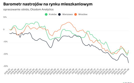 Barometr nastrojów na rynku mieszkaniowym, który dla „Nieruchomości” „Rzeczpospolitej” Otodom Analytics przygotowuje co miesiąc, od roku, jak mówi Marcin Krasoń, "błąka się w okolicy historycznych minimów".