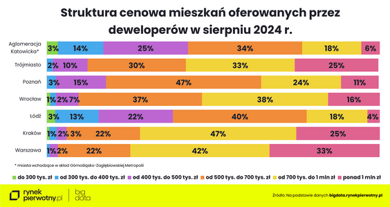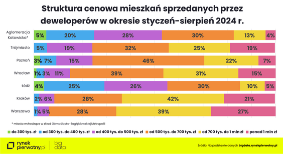 Z danych BIG DATA RynekPierwotny.pl wynika, że w tym roku łódzcy deweloperzy sprzedali 140 mieszkań wycenionych na mniej niż 300 tys. zł. - Pod koniec sierpnia w ofercie było już tylko niespełna 200 takich lokali. Generalnie obie te metropolie wyróżniają się na tle innych wysokim odsetkiem mieszkań, które można kupić, mając do dyspozycji 500 tys. zł – zaznacza Marek Wielgo. - Dlatego też ponad połowa mieszkań sprzedanych w ciągu ośmiu miesięcy tego roku przez łódzkich i śląskich deweloperów nie przekraczała tego pułapu cenowego. Przy czym nie wszyscy rzucili się na najtańsze mieszkania, które najczęściej mają niewielki metraż lub są zlokalizowane na obrzeżach miast.