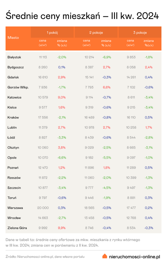 Portal Nieruchomosci-online.pl objął analizą 18 miast wojewódzkich. W III kwartale tego roku średnie ceny ofertowe kawalerek spadły w ośmiu stolicach województw, ceny mieszkań dwupokojowych – w sześciu, a trzypokojowych – w ośmiu. Było też sporo przypadków ustabilizowania się cen na poziomie z II kwartału.