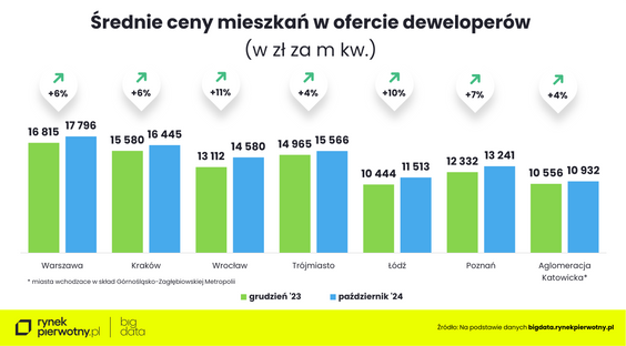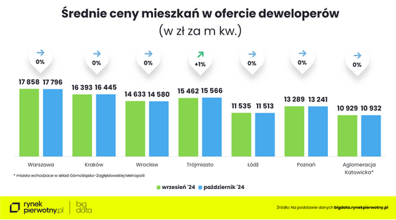 W Warszawie, Krakowie i Poznaniu październik był drugim z rzędu miesiącem, w którym ta średnia nie drgnęła. Podwyżki wyhamowały we Wrocławiu, Łodzi i w miastach Górnośląsko-Zagłębiowskiej Metropolii. W Trójmieście średnia cena metra kwadratowego mieszkań w ofercie deweloperów wzrosła w październiku o 1 proc.