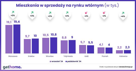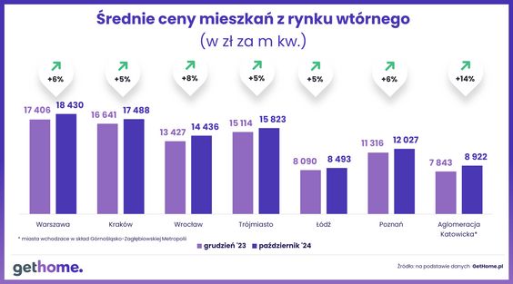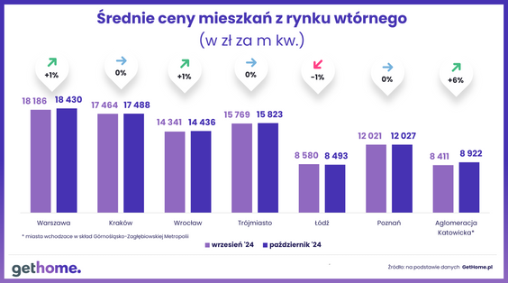 - Październik przyniósł dość nieoczekiwany obrót na rynku wtórnym w Warszawie, Wrocławiu i miastach Górnośląsko-Zagłębiowskiej Metropolii. Zamiast oczekiwanego przez kupujących spadku odnotowaliśmy wzrost średniej ceny mieszkań – wskazują analitycy portalu GetHome.pl. - W Krakowie, Trójmieście i Poznaniu średnia cena utrzymała poziom z września, a w Łodzi nieznacznie spadła.