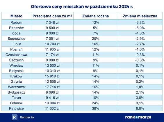 - Przeciętna zmiana miesięczna była jednak ujemna i wyniosła -0,3 proc. miesiąc do miesiąca – wskazują autorzy raportu. - W porównaniu z wrześniem najmocniej spadły ceny mieszkań w Radomiu (6 proc.), Rzeszowie (5 proc.) i Łodzi (4 proc.). Z kolei duży wzrost odnotowaliśmy w Katowicach (9 proc.).
