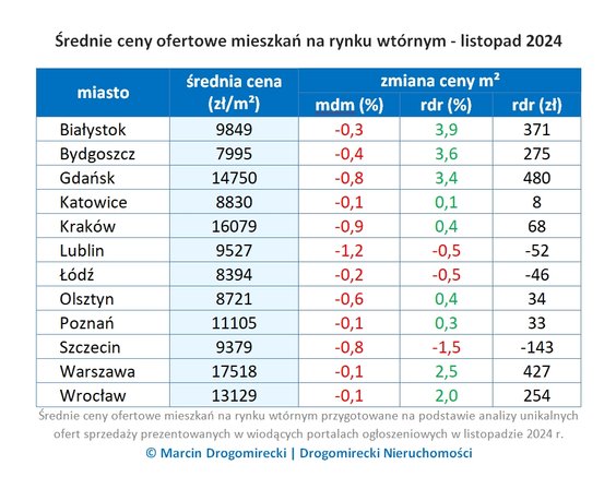 Widać to już wyraźnieć w porównaniu cen rok do roku. - Nie ma już imponujących wartości, czyli pamiętnych wzrostów o 15, 25 czy nawet 35 proc. (tak było w Krakowie w kwietniu tego roku) – mówi Marcin Drogomirecki. - Pozostały jeszcze drobne wartości dodatnie, ale te nie przekraczają wskaźnika inflacji (CPI w listopadzie: 4,7 proc. r./r.). Uwagę zwracają jednak pierwsze spadki. W trzech miastach – Lublinie, Łodzi i w Szczecinie - średnie ceny ofertowe mieszkań na rynku wtórnym w listopadzie 2024 roku spadły poniżej poziomów zanotowanych w listopadzie ubiegłego roku, czyli w okresie działania programu „Bezpieczny kredyt 2 proc.” Mówi się, że pierwsza jaskółka wiosny nie czyni. Ale... trzy?