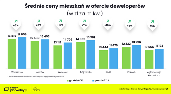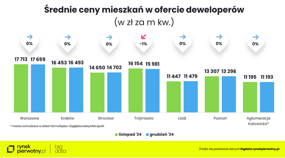 Jak podkreśla Marek Wielgo, ekspert portalu RynekPierwotny.pl, sam grudzień 2024 roku nie przyniósł zmian średniej ceny ofertowej mkw. mieszkań oferowanych przez deweloperów w siedmiu największych metropoliach.