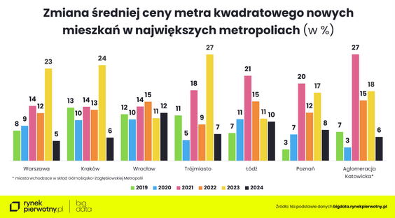 Wielgo zwraca uwagę, że przeciętne ceny mkw. nowych mieszkań w 2024 roku wzrosły we wszystkich analizowanych metropoliach, ale aż w pięciu podwyżka była jednocyfrowa. – A to nie zdarzyło się w ciągu ostatnich sześciu lat – podkreśla ekspert portalu RynekPierwotny.pl.