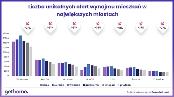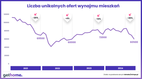 Podaje, przywołując dane przeszukiwarki portali nieruchomości Adradar, że pod koniec grudnia ubiegłego roku w całym kraju było ok. 60,5 tys. unikatowych ofert wynajmu mieszkań, czyli aż o 30 proc. mniej niż jeszcze trzy miesiące wcześniej.
