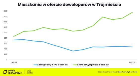 Analityk przypomina, że np. w listopadzie ubiegłego roku przeciętna cena mkw. mieszkań na trójmiejskim rynku pierwotnym wzrosła aż o 4 proc., a w kolejnych dwóch miesiącach spadła o 2 proc. - Trójmiasto jest specyficzną metropolią. Ze względu na jej atrakcyjność turystyczną powstaje tu dużo drogich mieszkań. W ciągu ostatnich 12 miesięcy z niespełna 900 do blisko 1800 wzrosła w ofercie deweloperów liczba mieszkań z ujawnioną ceną ponad 20 tys. zł za metr – wskazuje Marek Wielgo. - Ich udział w ofercie wzrósł zaś z ok. 18 do 25 proc. Jednocześnie w lutym po raz pierwszy od sześciu miesięcy ubyło najtańszych lokali z cenami poniżej 10 tys. zł za metr.