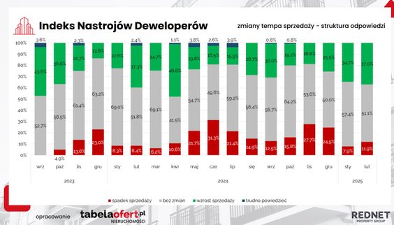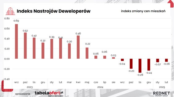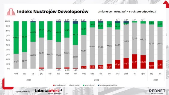 A jeszcze w styczniu tego roku 80 proc. firm, które brały udział w badaniu indeksu nastroju deweloperów twierdziło, że ceny mieszkań się nie zmienią. W lutym odsetek ten spadł do 70 proc.