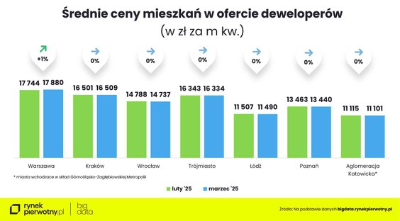 Jak dodaje, marzec był siódmym miesiącem z rzędu, w którym nie wzrosła średnia cena mkw. mieszkań oferowanych przez deweloperów w Krakowie (16,5 tys. zł/mkw.). - W Łodzi (ok. 11,5 tys. zł/m kw.) seria bez podwyżek trwa już szósty miesiąc, zaś czwarty w miastach Górnośląsko-Zagłębiowskiej Metropolii (ok. 11,1 tys. zł/mkw.) – podaje Marek Wielgo. - Poziom z lutego utrzymała średnia cena mkw. nowych mieszkań w Poznaniu (ok. 13,4 tys. zł/mkw.), gdzie po jednorazowej zwyżce w styczniu o 1 proc. rynek wrócił do stabilizacji.
