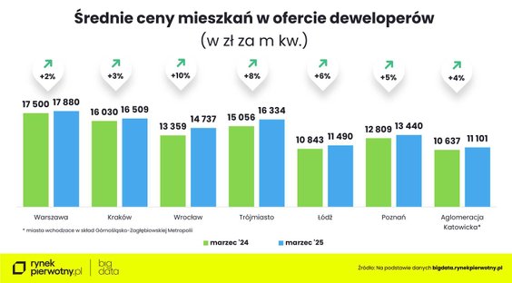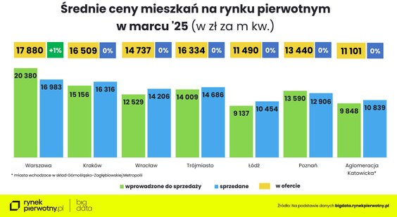 Ze wstępnych danych BIG DATA RynekPierwotny.pl wynika, że stabilizacja średniej ceny metra nowych mieszkań wróciła do Trójmiasta (ok. 16,3 tys. zł za mkw. nowego mieszkania) i Wrocławia (ok. 14,7 tys. zł/mkw.). - W obu metropoliach wzrosła podaż stosunkowo tanich lokali. W Trójmieście wprowadzone w marcu do sprzedaży mieszkania kosztowały średnio 14 tys. zł za mkw., a we Wrocławiu - 12,5 tys. zł za metr – podaje Marek Wielgo.