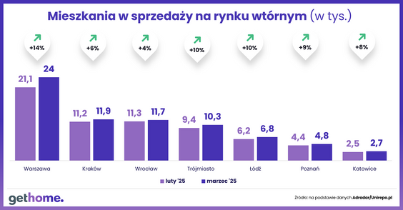 Jak wynika z danych przeszukiwarki portali nieruchomości Adradar, w Łodzi liczba unikatowych ofert sprzedaży mieszkań z drugiej ręki zwiększyła się od początku roku z 5,2 tys. do 6,8 tys., czyli aż o 31 proc. - W pozostałych metropoliach sytuacja podażowa wyglądała podobnie – wskazują analitycy GetHome.pl.