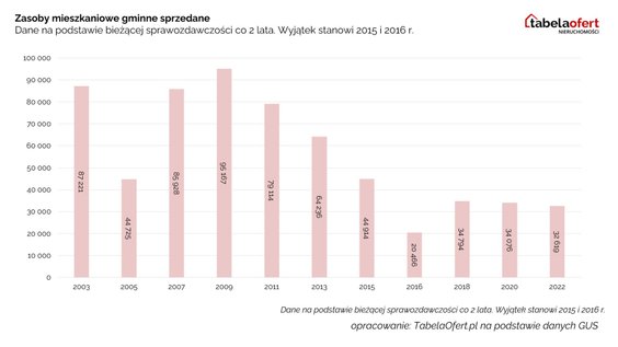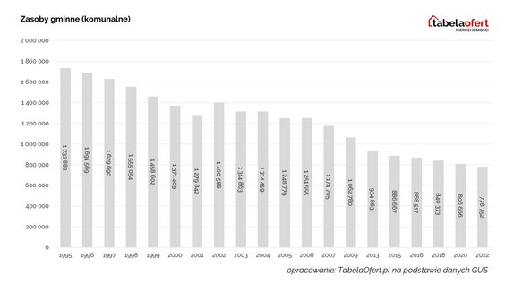 Pod koniec 2022 roku gminy dysponowały zaledwie 778 750 lokalami komunalnymi – to 43 proc. mniej niż w roku 2000 i aż o 55 proc. mniej niż w 1995 roku, gdy zasób liczył ponad 1,7 mln mieszkań. W latach 2003–2022 sprzedano ponad 620 tys. mieszkań komunalnych, z czego rekordowy był rok 2009, kiedy to zawarto ponad 95 tys. transakcji. Często odbywały się one z bardzo wysokimi bonifikatami, co pozwalało nabywcom kupować mieszkania niemal za darmo – niejednokrotnie w centralnych, atrakcyjnych lokalizacjach.
