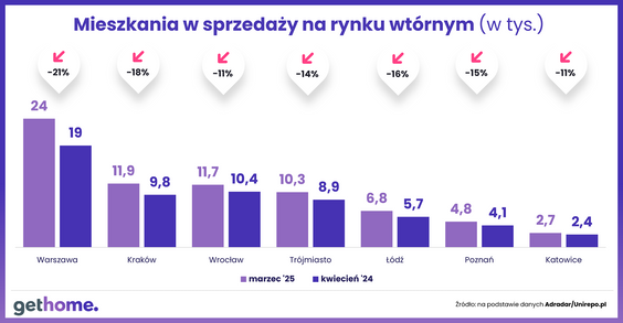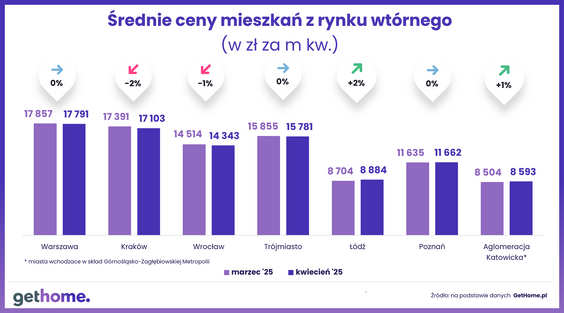 Eksperci serwisu GetHome.pl wskazują, że nie tylko w stolicy i Krakowie, ale też we Wrocławiu, Trójmieście i Poznaniu kwiecień był kolejnym miesiącem, który upłynął pod znakiem stabilizacji lub spadku średniej ceny metra kwadratowego mieszkań na rynku wtórnym. W górę – 0 2 proc. - poszła przeciętna cena mkw. lokali z drugiej ręki w Łodzi, a w miastach Górnośląsko-Zagłębiowskiej Metropolii - o 1 proc.