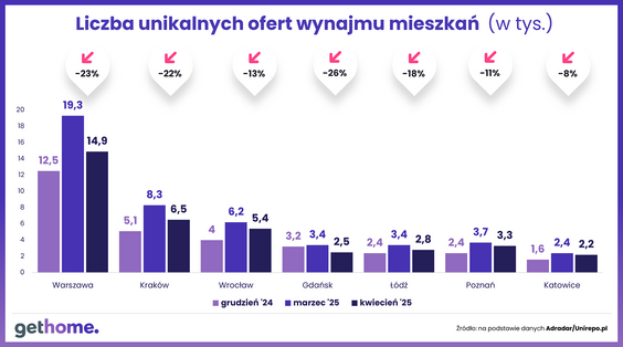 Jak mówi Marek Wielgo, ekspert portalu GetHome.pl, w większości największych miast mieszkania na wynajem – biorąc pod uwagę średnie stawki - są wciąż tańsze niż pod koniec ubiegłego roku. – Ale ci, którzy dopiero planują zawarcie umowy najmu, powinni się liczyć z większym wydatkiem. Najtańsze lokale szybko znikają z rynku – podkreśla Wielgo. Jako przykład ekspert podaje Warszawę. Stołeczny rynek jest największy.