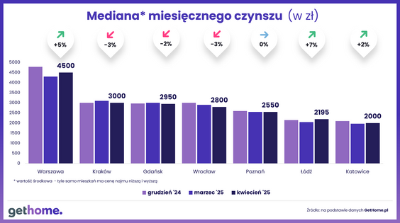 Z danych GetHome.pl wynika, że kwietniu w porównaniu z marcem mediana czynszu za wynajem mieszkania wzrosła aż o 5 proc., do ok. 4,5 tys. zł za miesiąc. Ale wcześniej – przez trzy miesiące – spadła w sumie o 10 proc.