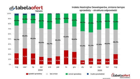 Maj przyniósł pogłębienie skrajnych opinii wśród deweloperów. Odsetek firm przewidujących spadki tempa sprzedaży mieszkań wzrósł z 10 proc. w kwietniu do 20 proc. w maju (to najwyższy poziom pesymizmu od początku roku). Ponad 30 proc. firm spodziewa się wzrostów sprzedaży w kolejnych miesiącach.