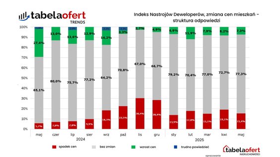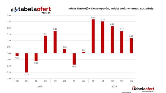 Indeks zmiany tempa sprzedaży, spadający systematycznie od stycznia 2025 roku, osiągnął w maju poziom zaledwie 0,12, co potwierdza, że optymizm deweloperów widoczny na początku roku stopniowo słabnie.