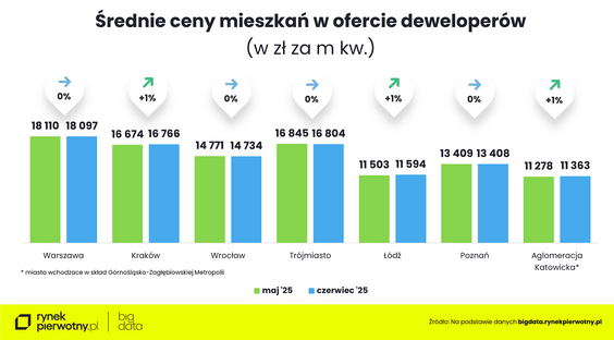 - Pierwsze półrocze tego roku w większości metropolii upłynęło pod znakiem stabilizacji średniej ceny metra kwadratowego nowych mieszkań – komentuje Marek Wielgo, ekspert portalu RynekPierwotny.pl. - Oczywiście zdarzały się jej wzloty. Pamiętajmy jednak, że dzieje się tak nie tylko wtedy, gdy deweloperzy podnoszą ceny. Ten sam efekt może przynieść pojawienie się na rynku droższych lokali, wyprzedaż najtańszych lokali albo kombinacja obydwu czynników. W czerwcu z taką sytuacją mieliśmy do czynienia np. w Łodzi – zauważa.