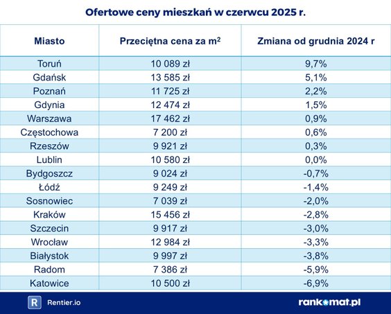Są jednak wyjątki. Największe wzrosty cen mieszkań od grudnia 2024 r. zanotowano w Toruniu (9,7 proc.) i Gdańsku (5,1 proc.). Największe spadki odnotowano w Katowicach (minus 6,9 proc.) i Radomiu (minus 5,9 proc.).