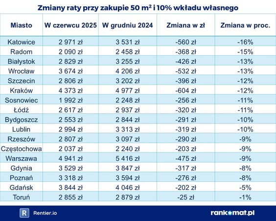– Choć spadki cen mieszkań nie są imponujące (średnio o 0,5 proc. od grudnia 2024 roku), to dostępność mieszkań znacząco rośnie. Połączony efekt niższych cen i spadku oprocentowania sprawił, że raty nowo udzielanych kredytów na mieszkanie o powierzchni 50 mkw. spadły w badanych miastach o 10 proc. – szacują autorzy raportu Rankomat.pl i Rentier.io.