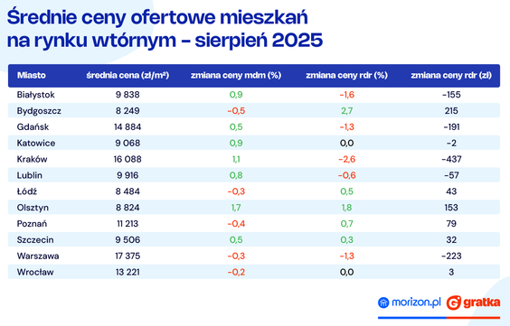 Analiza objęła 12 miast. Największy miesięczny wzrost średniej ceny ofertowej mieszkań z rynku wtórnego Grupa Morizon-Gratka odnotowała w Olsztynie. W porównaniu z lipcem poszła w górę o 1,7 proc. W Krakowie – o 1,1 proc.