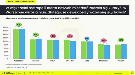 Z danych BIG DATA RynekPierwotny.pl wynika, że w Warszawie, Krakowie, Wrocławiu, Trójmieście, Łodzi, Poznaniu i w miastach Górnośląsko-Zagłębiowskiej Metropolii deweloperzy znaleźli w trzecim kwartale chętnych na ok. 13,3 tys. mieszkań, to aż o 12 proc. więcej niż w poprzednich trzech miesiącach tego roku.