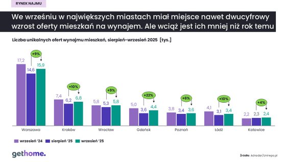 Z danych przeszukiwarki portali nieruchomości Adradar wynika, że we wrześniu na rynku najmu w całym kraju pojawiło się ok. 62 tys. nowych unikatowych ofert, o 6 proc. więcej niż w sierpniu. W efekcie (biorąc pod uwagę mieszkania wycofane z oferty, w domyśle – wynajęte) oferta zwiększyła się z 76,5 tys. do 81 tys., czyli również o 6 proc.