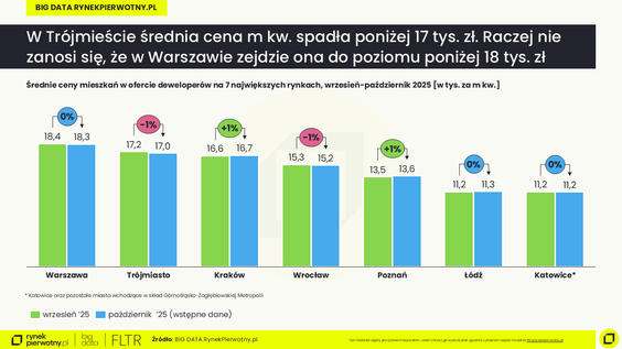 Ze wstępnych danych BIG DATA RynekPierwotny.pl wynika, że Kraków i Poznań były jedynymi metropoliami, w których średnia cena metra kwadratowego mieszkań oferowanych przez deweloperów wzrosła o 1 proc. – W obu przypadkach był to efekt wprowadzenia do sprzedaży drogich mieszkań – tłumaczy Marek Wielgo. – Np. w Krakowie ich średnia cena w przeliczeniu na metr kwadratowy sięgała 18,5 tys. zł, a w Poznaniu – 16 tys. zł. W efekcie średnia dla wszystkich lokali w ofercie wynosiła pod koniec października 16,7 tys. zł i 13,6 tys. zł za metr, odpowiednio.
