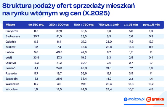 W każdym z tych miast oferty w cenie do 350 tys. zł miały w październiku tylko kilkuprocentowy udział w rynku i były to niemal wyłącznie kawalerki.