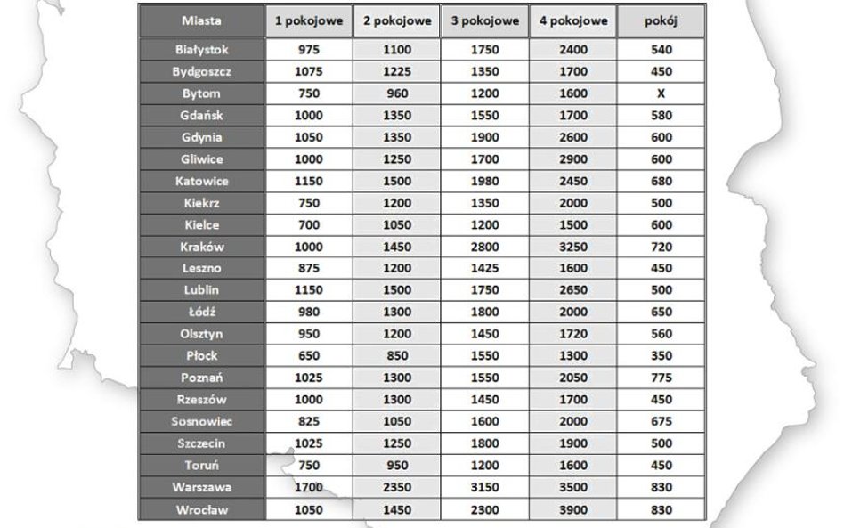 Z analiz portalu Morizon.pl wynika, że w Warszawie studenci szukają kawalerek z czynszem do 1,2 - 1,5 tys. zł oraz dwupokojowych lokali z czynszem do 1,7 tys. zł. - W Gdańsku studenci są w stanie wydać na mieszkanie 600 - 700 zł (od osoby), w Poznaniu - 500-700 zł, a w Krakowie -500-550 zł. - Coraz mniejszym zainteresowaniem cieszą się pojedyncze pokoje, chyba że współlokatorami są inni studenci. Mieszkanie wspólnie z właścicielami mieszkania nie wchodzi w grę - mówi Marcin Drogomirecki.