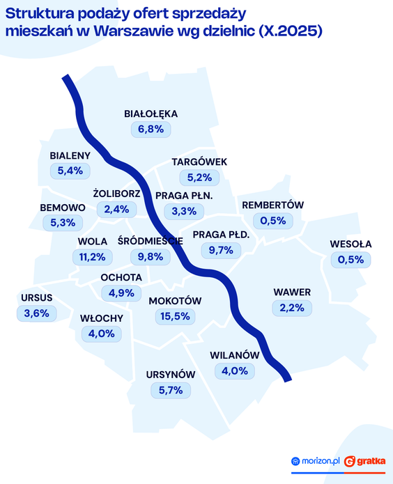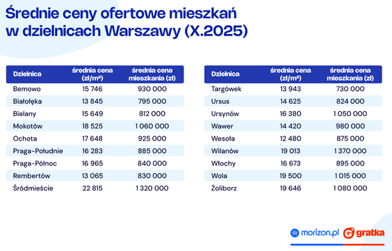 Z analizy cen mieszkań oferowanych do sprzedaży w serwisach nieruchomości Grupy Morizon-Gratka w październiku wynika, że najdroższą warszawską dzielnicą jest niezmiennie Śródmieście. Średnia cena metra kwadratowego używanego lokalu w centrum stolicy wynosiła w październiku 22,8 tys. zł. To prawie o jedną trzecią więcej niż średnia dla całego miasta (ponad 17,4 tys. zł/mkw.) i o ponad 82 proc. więcej niż średnia cena używanego mieszkania w najtańszej pod tym względem dzielnicy Warszawy, czyli Wesołej (niemal 12,5 tys. zł/mkw.).