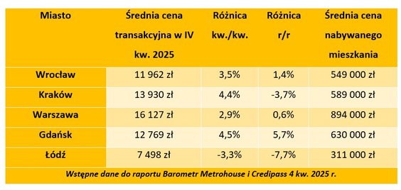 Średnie ceny transakcyjne mieszkań z drugiej ręki analizują sieciowa agencja Metrohouse i firma doradztwa finansowego Credipass. Z najnowszego raportu wynika, że obniżki stóp procentowych (w 2025 r. było ich sześć, w sumie stopy spadły z 5,75 do 4 proc.) wpłynęły na zwiększenie zainteresowania mieszkaniami.