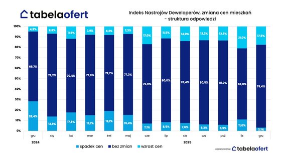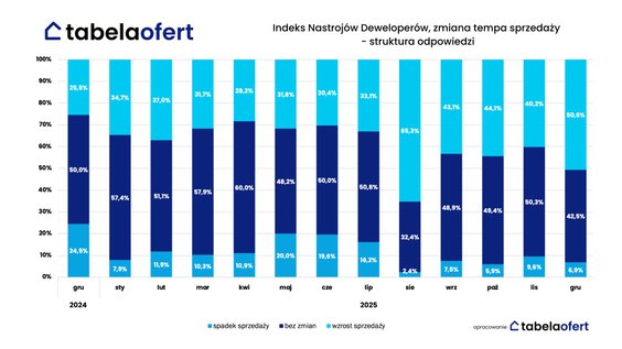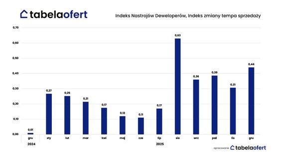 Jak mówią autorzy indeksu nastrojów deweloperów portalu Tabelaofert.pl, optymizm deweloperów ma realne podstawy. – Potwierdzają to dane z grudnia 2025 r., kiedy to sprzedaż nowych mieszkań wyraźnie przyspieszyła. Tzw. indeks zmiany tempa sprzedaży wzrósł do poziomu 0,44, jednego z najwyższych w całym 2025 r. – podają analitycy serwisu. Dalszego wzrostu liczby transakcji spodziewa się ponad połowa badanych firm. Odsetek pesymistów systematycznie maleje.