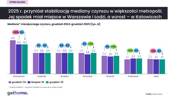 Serwis GetHome.pl analizuje sytuację na rynku najmu mieszkań w grudniu i w całym 2025 r. Jak mówi Marek Wielgo, ekspert portalu, najsłabszym miesiącem pod względem dostępności lokali tradycyjnie okazał się grudzień. – To normalne ze względu na sezonowość na rynku najmu, że w końcówce roku oferta mieszkań gwałtownie się kurczy, a aktywność najemców stopniowo słabnie. Jednak zwykle już w lutym rynek zaczyna się ożywiać – zaznacza.