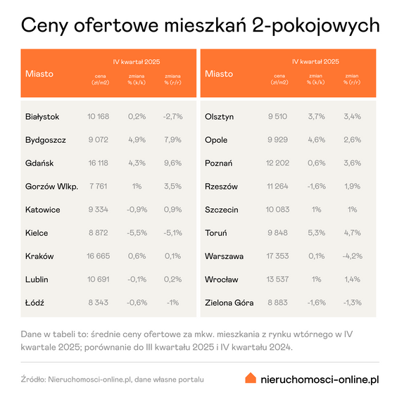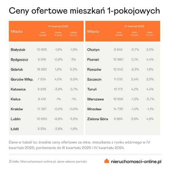 W IV kwartale 2025 r. średnia cena ofertowa kawalerek z drugiej ręki spadła w ciągu kwartału w ośmiu miastach wojewódzkich: w Warszawie, we Wrocławiu, w Łodzi, Lublinie, Białymstoku, Katowicach, Kielcach i Rzeszowie.