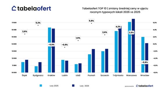 Autorzy barometru podkreślają, że stabilizacja średnich cen mieszkań nie oznacza „bezruchu w ofertach”. W lutym zmieniono ceny 17,9 proc. wszystkich mieszkań dostępnych w analizowanych miastach – to najwyższy odsetek od października 2025 r. Podwyżki objęły 10,4 proc. oferty, a obniżki 7,5 proc. W praktyce oznacza to zmianę ceny niemal co szóstego oferowanego mieszkania. – Choć podwyżek było więcej niż obniżek, to przeciętna skala obniżki była większa niż przeciętna podwyżka. Średnia korekta w dół wyniosła 5 proc., podczas gdy podwyżki sięgały średnio 4,06 proc. – podają analitycy.